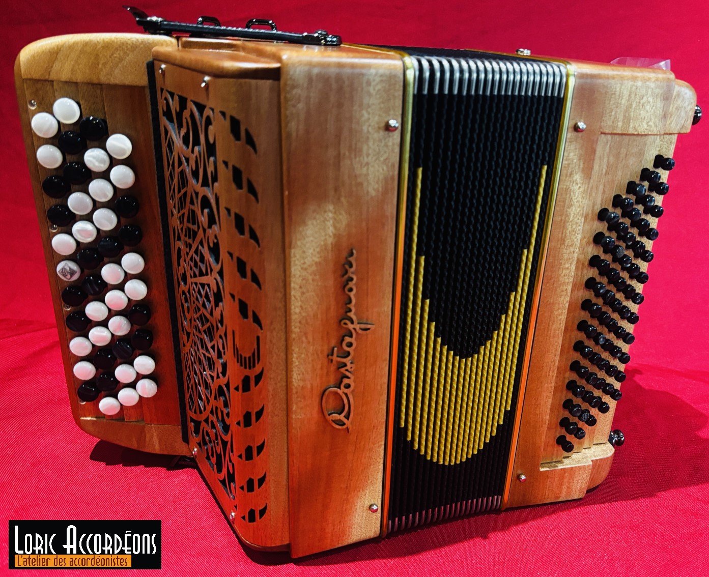 - 4 rangs, 66 boutons, 49 notes, 2 voix : 2 flûtes accordés musette léger (possibilitée de modification du vibrato sans supplément), 3 registres (2 sons).